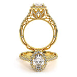 VENETIAN-5061CU-TT engagement ring from the Venetian Collection features a unique diamond adorned basket topped with a cushion shaped single halo made for a round center. A delicate straight shank encrusted with round brilliant diamonds completes this bea