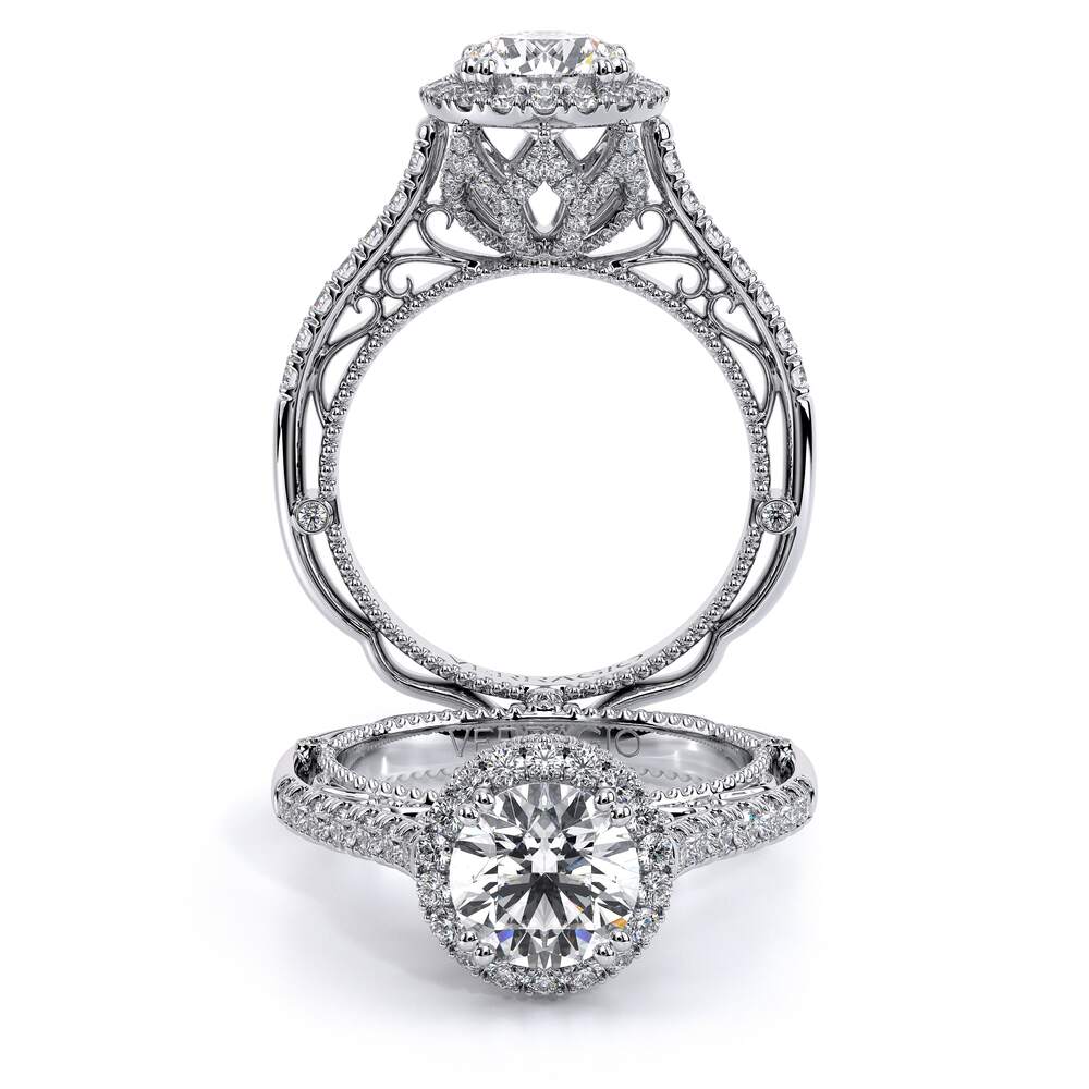 VENETIAN-5061R engagement ring from the Venetian Collection features a unique diamond adorned basket topped with a round single halo. A delicate straight shank encrusted with round brilliant diamonds completes this beautiful ornate design.