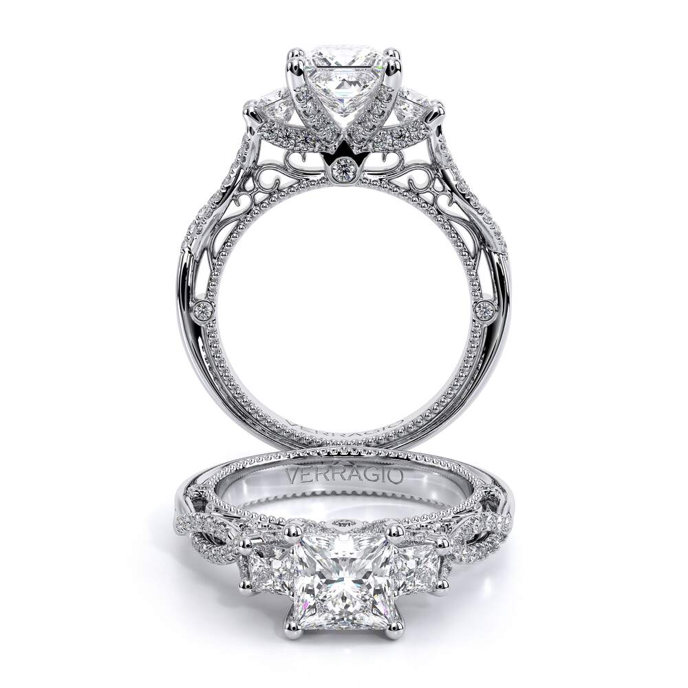 VENETIAN-5079P engagement ring from the Venetian Collection features a vintage style three stone princess diamond prong setting each encrusted with round brilliant diamonds. Our Verragio signature beading and lace detail beautifully binds together all ele