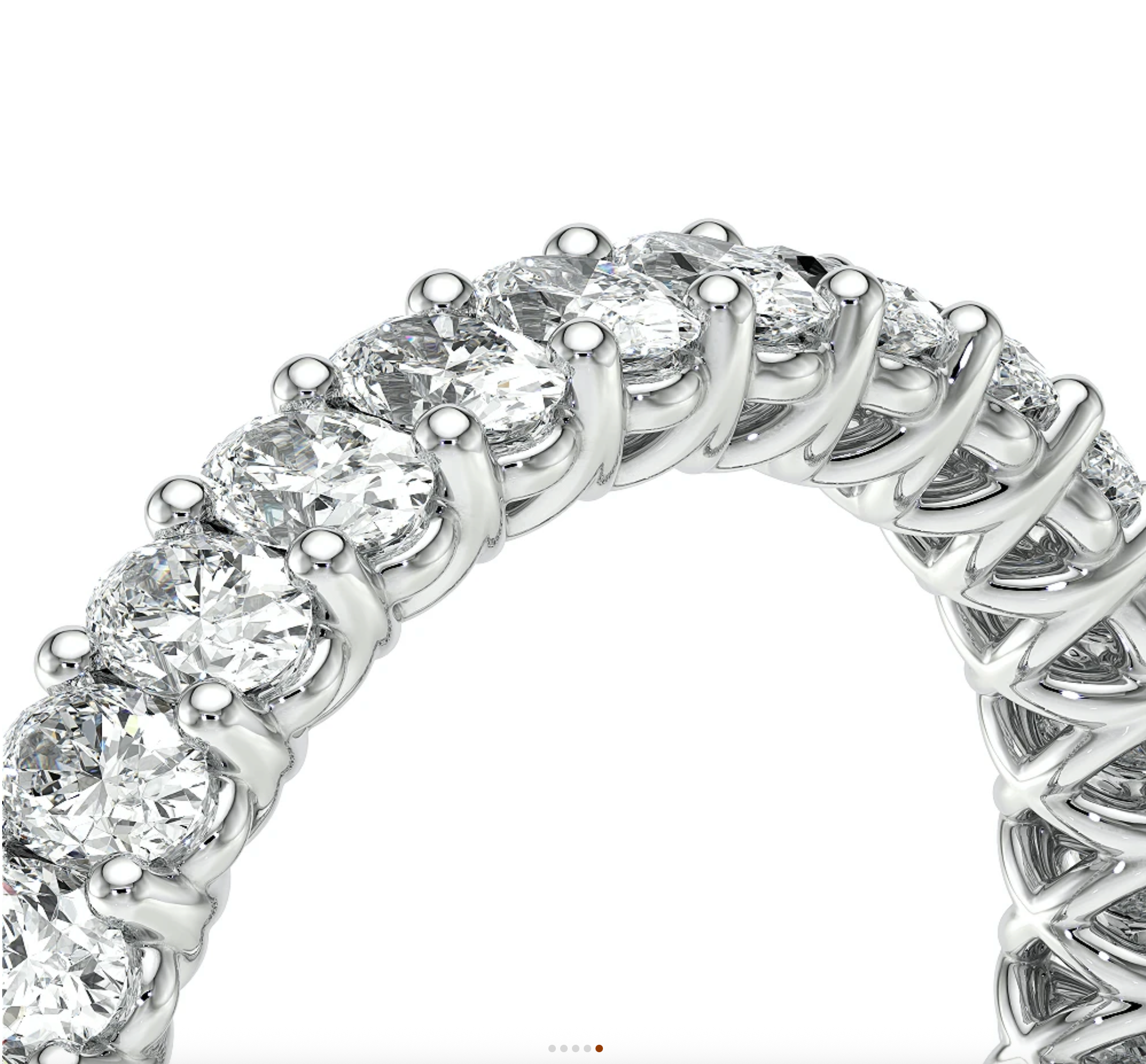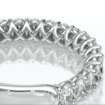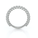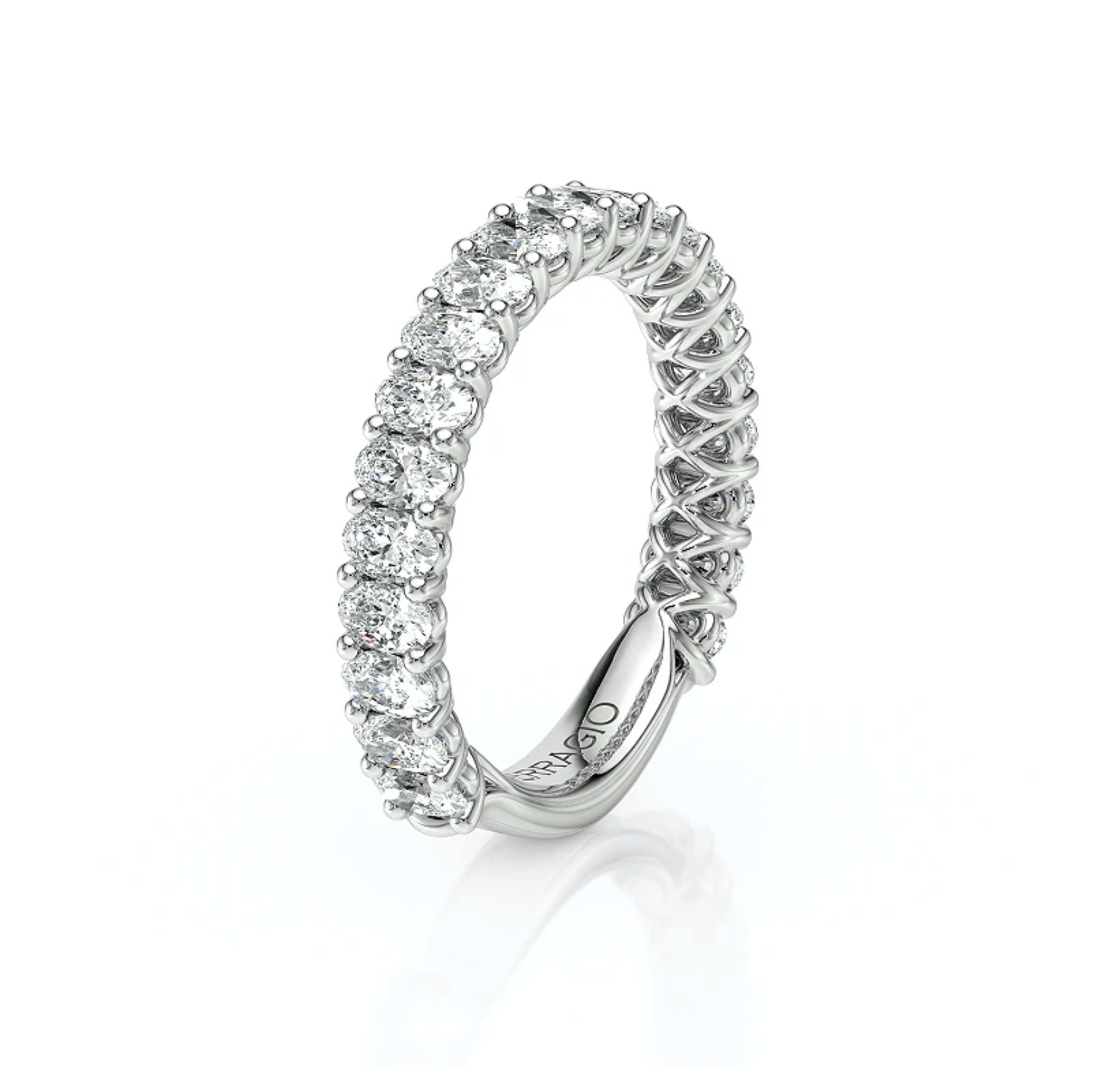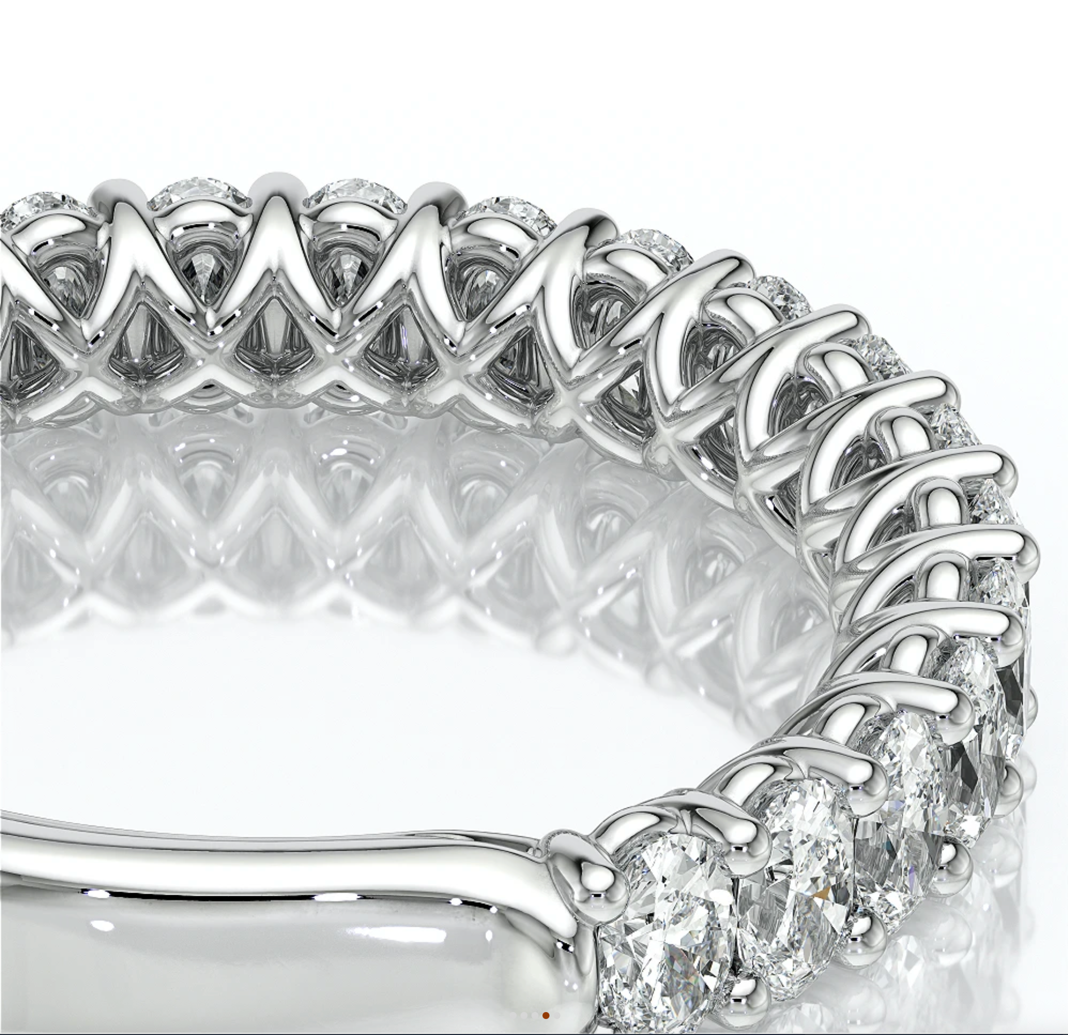 This refined wedding band highlights diamonds set to capture light from every angle, designed to showcase their full brilliance. The shank is adorned with 3.5mm oval diamonds flowing 3/4 of the way around in a north-south orientation.