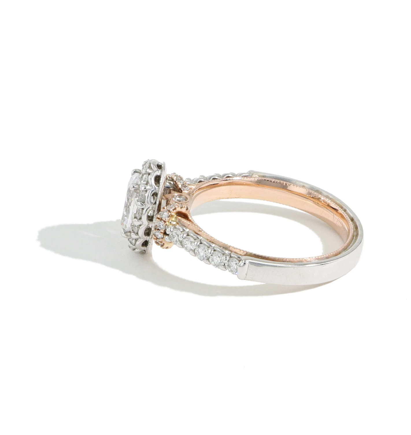 A two tone Verragio Classic oval halo engagement ring setting with a four prong set oval center diamond. Features .55ctw pave diamonds around the halo and 1/2 way around the vintage style band. Beautifully crafted in 14K white gold on the outside and 14K rose gold on the inner part of the ring.
