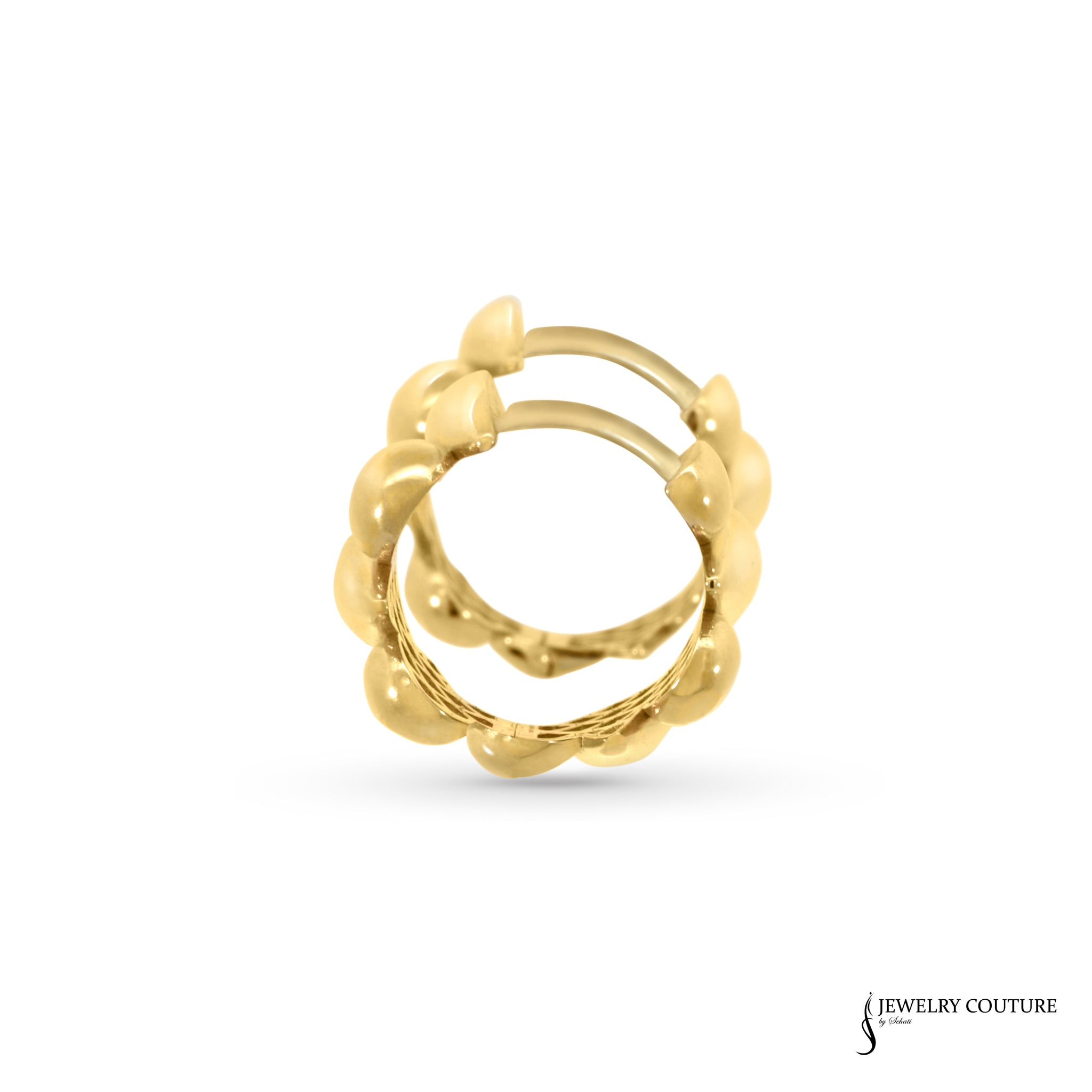 Add a touch of elegance to your outfit with our Versilla 14KT Yellow Gold Huggie Earrings. These chunky, geometric earrings feature alternating raindrop details that catch the eye and add a unique touch to any look. Crafted in high-quality 14KT gold, these huggie earrings are a luxurious addition to your jewelry collection.