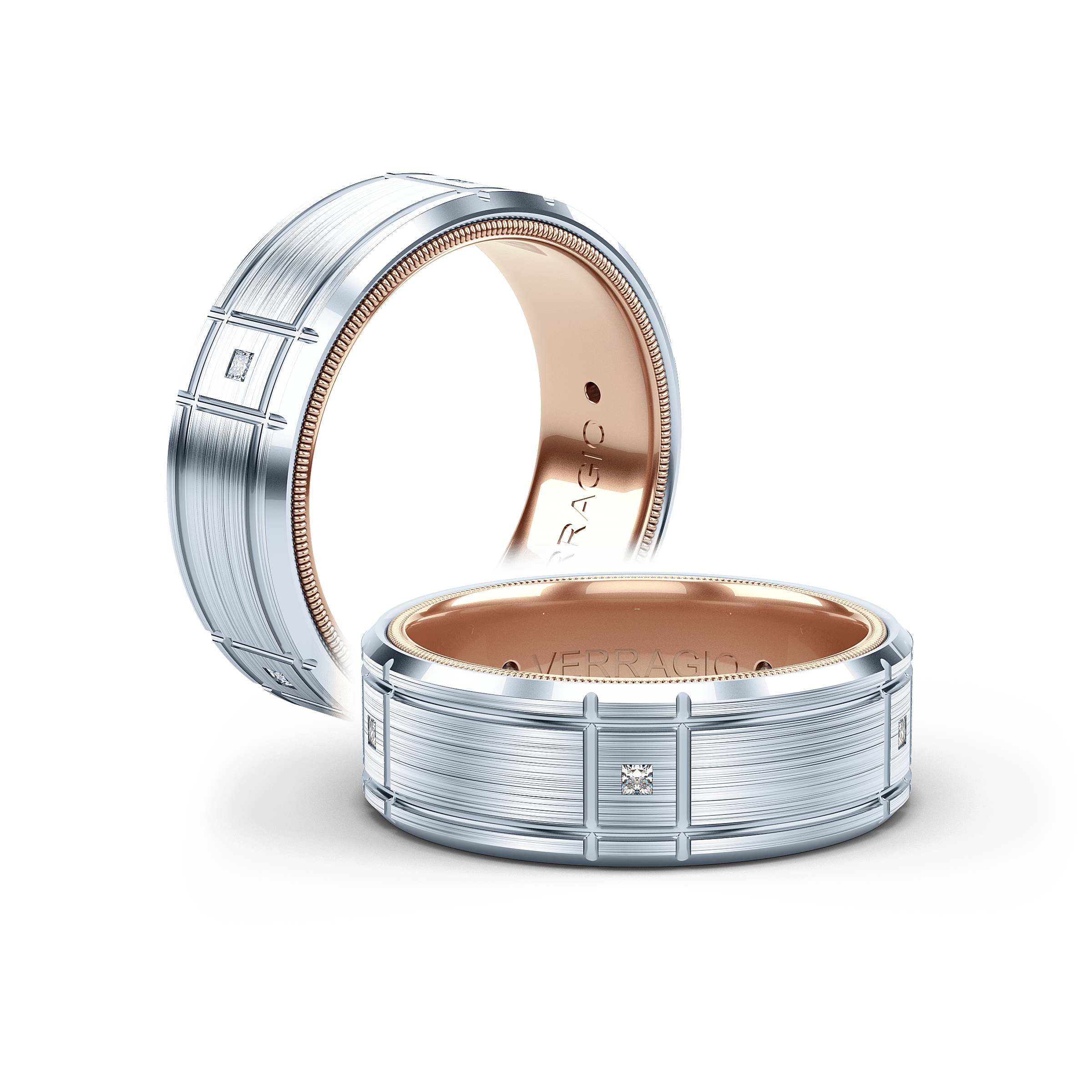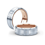 VWD-8905 is our timeless 8MM width diamond men's band with a matte finish. Adorned with princess cuts throughout the band the skillfully high polished edges are enhanced by Verragio's signature rose gold beading.