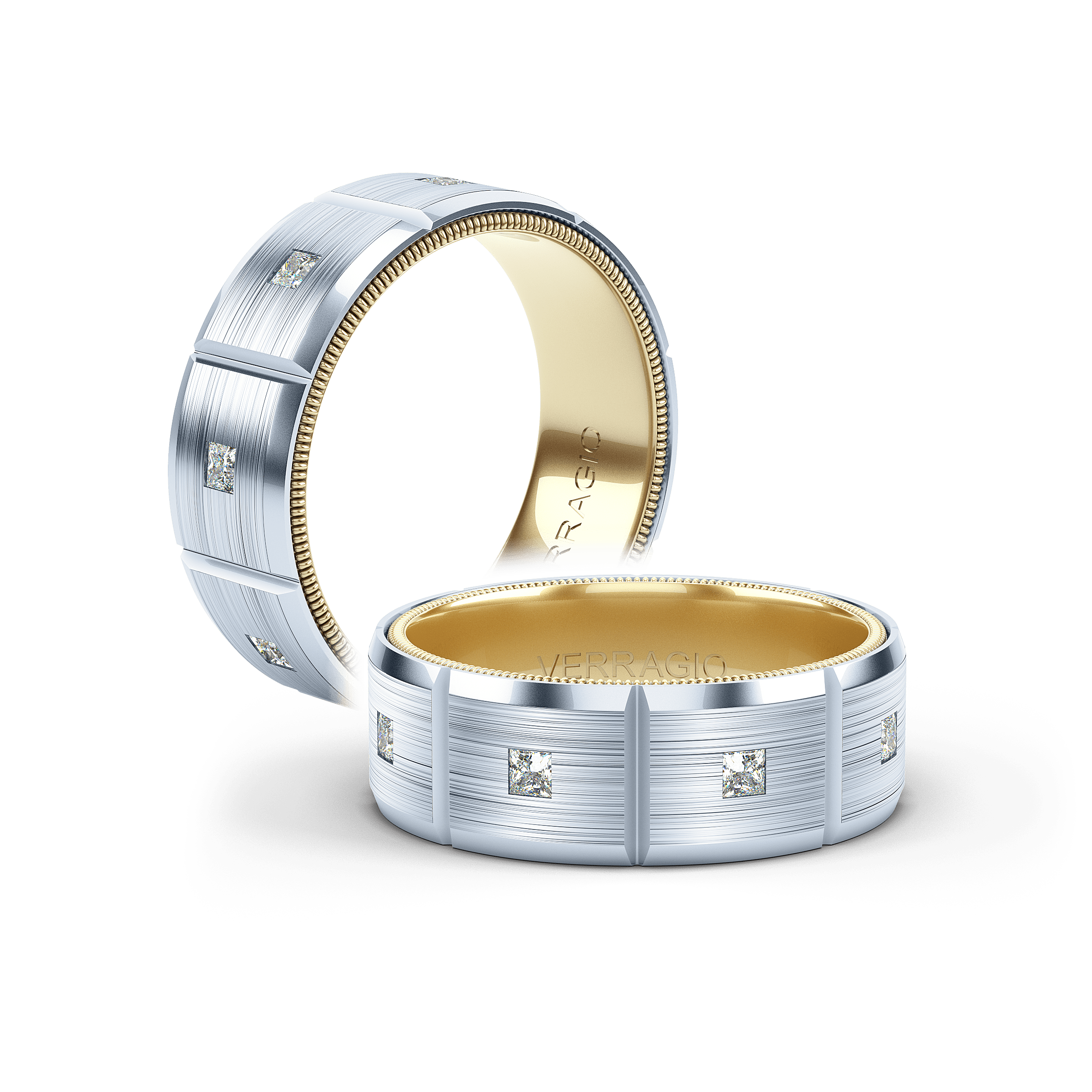 VWD-8906 is a modern matte finish Geometric 8MM width diamond men's band. Adorned with princess cut diamonds throughout the band the skillfully high polished edges are enhanced by Verragio's signature rose gold beading.